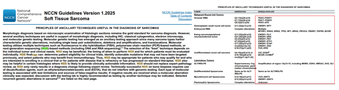 2025 V1 NCCN指南推荐通过NGS辅助软组织肉瘤的鉴别诊断(部分表)