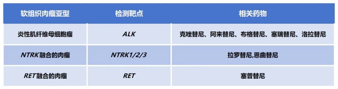 有研究显示3,约61%的软组织肉瘤患者存在潜在可靶向基因突变,具有靶向治疗的可能。因此,对软组织肉瘤进行分子检测还可用来发现新的治疗靶点。例如存在CDK4/6扩增的高分化脂肪肉瘤、去分化脂肪肉瘤中,CDK4/6抑制剂(如哌柏西利)可阻断细胞周期进展,改善预后;某些在其他肿瘤中已确认的基因突变(如ALK融合、NTRK融合等)也可能存在于软组织肉瘤中,这为缺少治疗方案的患者提供了"异病同治"的可能性,从而为软组织肉瘤患者提供更多靶向治疗的机会。