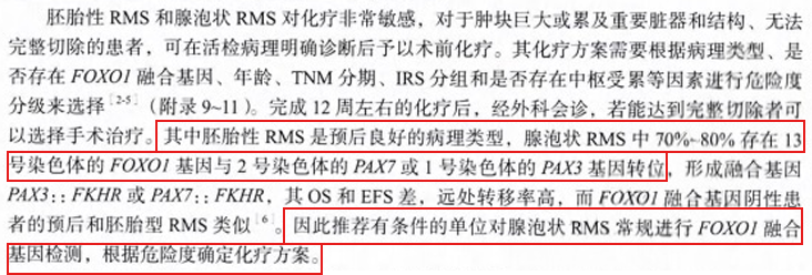 软组织肉瘤的基本治疗手段是手术和放化疗。不同分子分型和病理亚型对化疗的敏感性高度不同,因此治疗前需明确病理诊断和分子特征来选择针对性治疗方案:对于敏感型亚型(如尤文肉瘤、胚胎型/腺泡状横纹肌肉瘤等),化疗是重要治疗手段,其中70%~80%的腺泡状横纹肌肉瘤(RMS)存在FOXO1融合,因此COSO指南推荐应对其常规进行FOXO1融合基因检测,根据危险度确定化疗方案。